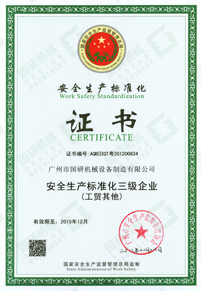 2012年12月24日,国家安全生产监督管理总局为马博在线注册公司颁发了《安全生产标准化企业证书》,这意味着我司已达到《广州市工业企业安全生产标准化评定办法》及《广州市工业企业安全生产标准化评定标准》的要求。